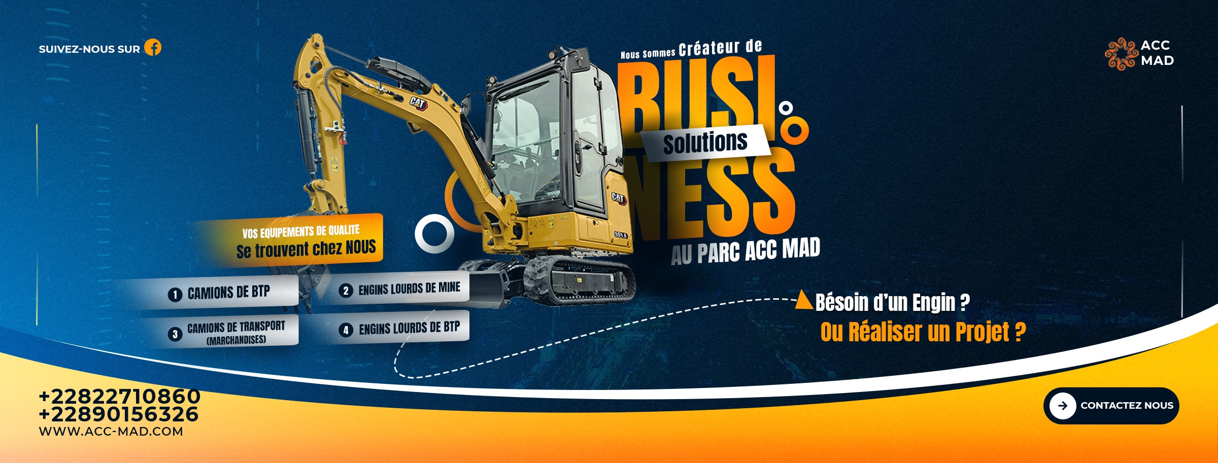 ACC MAD AFRICAN CARS CARRIER est une entreprise spécialisée dans la vente et la location de véhicules et équipements lourds professionnels à Lomé. Offrant une offre complète pour répondre à tous les besoins professionnels dans les secteurs du transport, de la construction et de la logistique, notre entreprise propose une gamme variée de véhicules utilitaires, camions, engins de chantier et équipements spécialisés. Avec un service de qualité, des produits fiables et un accompagnement professionnel, ACC MAD AFRICAN CARS CARRIER s'engage à fournir des solutions de mobilité et d'équipement adaptées aux exigences de chaque client, qu'il s'agisse d'achat ou de location courte et longue durée.